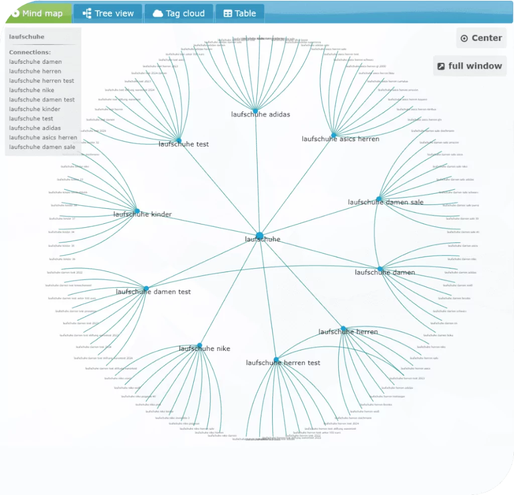 Oberhalb der Mind Map befinden sich fünf verschiedene Tabs, die jeweils eine andere Visualisierung der generierten Keywords bieten: