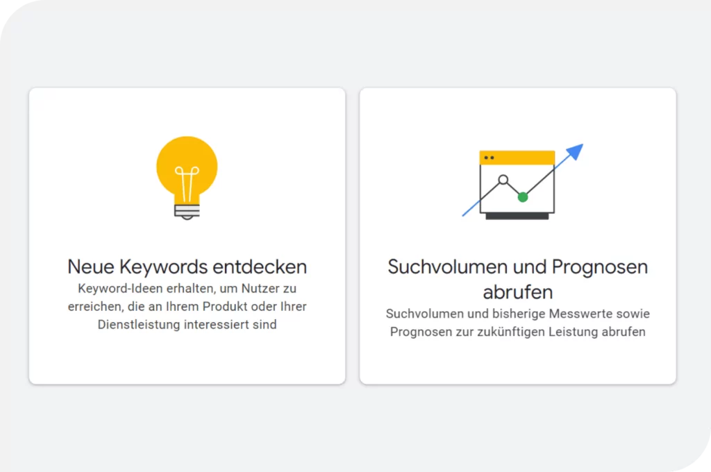 Der Google Keywords Planer ist ein kostenloses tool, das Ihnen Keywords-Ideen und Suchvolumina basierend auf Ihrer Website oder Ihren Produkten oder Dienstleistungen liefert. Sie finden den Keyword-Planner in Ihrem Google Ads Konto unter „Tools“.